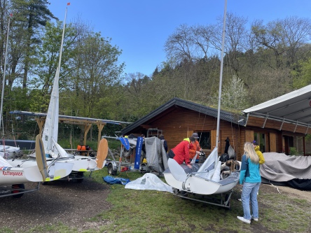 Anfang März startet die Regattasaison. Fabian und Antonia tauften bei der leider sehr windschwachen Auftraktregatta auf dem Baldeneysee das graue Boot zum ersten Mal in der Region.